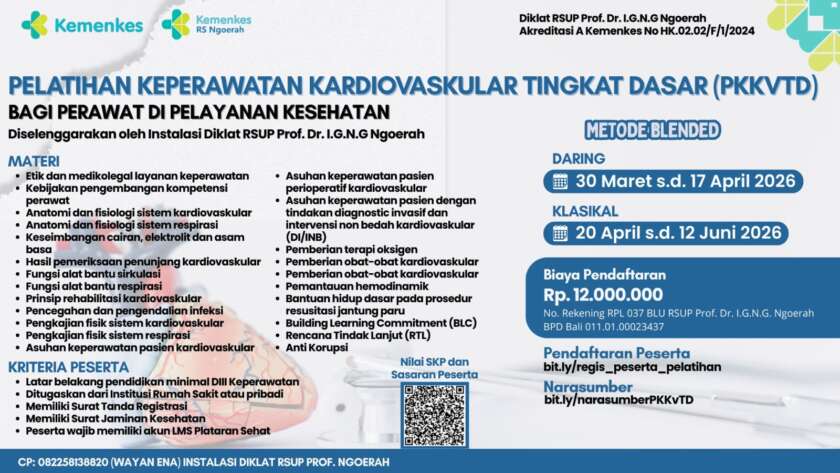Pelatihan Keperawatan Kardiovaskular Tingkat Dasar (PKKvTD) bagi Perawat di Pelayanan Kesehatan Pelatihan Keperawatan Kardiovaskular Tingkat Dasar (PKKvTD) merupakan program pelatihan dasar yang dirancang untuk meningkatkan pengetahuan, sikap, dan keterampilan perawat dalam memberikan asuhan keperawatan pada pasien dengan gangguan sistem kardiovaskular. Pelatihan ini ditujukan bagi perawat yang bekerja di berbagai fasilitas pelayanan kesehatan, seperti rumah sakit,…