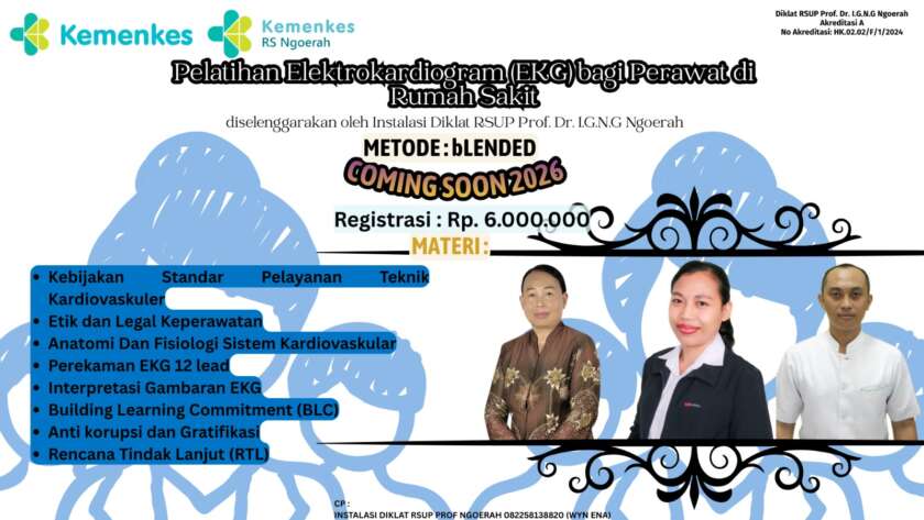 Pelatihan Elektrokardiogram (EKG) bagi Perawat di Rumah Sakit METODE : Blended Learning Venue : 1. Online 2. Diklat RSUP Prof Ngoerah Price : Rp. 6.000.000