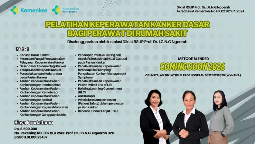 Pelatihan Penatalaksanaan Pasien Kanker dengan Kemoterapi bagi Perawat di Fasilitas Pelayanan Kesehatan METODE : Blended Learning Venue : 1. Online 2. Diklat RSUP Prof Ngoerah Price : Rp. 4.400.000