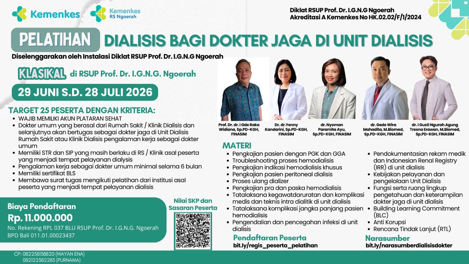 Pelatihan Dialisis bagi DOkter Jaga di Unit Dialisis METODE : Klasikal29 Juni s.d 28 Juli 2026Venue :1. Diklat RSUP Prof Ngoerah2. Sub. Instalasi Hemodialisis Price : Rp. 11.000.000 Pelatihan Keperawatan Kardiovaskular Tingkat Dasar (PKKvTD) bagi Perawat di Pelayanan KesehatanPelatihan Penatalaksanaan Pasien Kanker dengan Kemoterapi bagi Perawat di Fasilitas Pelayanan KesehatanPelatihan Elektrokardiogram (EKG) bagi Perawat di Rumah SakitProgram Khusus Perawat DiagnostikPelatihan Pengelolaan Sitostatika dan Sediaan Intravena bagi Tenaga Farmasi di Rumah Sakit Umum Pusat SanglahPelatihan Keperawatan Kanker Dasar bagi Perawat di Rumah SakitPelatihan Manajemen Keperawatan pasien kanker dengan KemoterapiPelatihan Asuhan Keperawatan Paliatif pada Pasien Kanker di Fasilitas Pelayanan KesehatanPelatihan CAPD bagi perawatPelatihan Dialisis bagi Perawat di Rumah Sakit dan Klinik Khusus DialisisPelatihan Dialisis Bagi Dokter Jaga Di Unit DialisisPelatihan Code Stroke Bagi Tim Stroke di Rumah SakitPelatihan Asuhan Keperawatan Pasien Stroke Dasar bagi Perawat di Rumah SakitPelatihan Basic Neuro Life Support (BNLS) Bagi Perawat di Rumah SakitPelatihan Edukator Diabetes Melitus pada Pasien Dewasa bagi Tenaga KesehatanPelatihan Basic Obstetri dan Neonatus Emergency Life SupportPelatihan Pelayanan Obstetri dan Neonatal Emergensi Komprehensif (PONEK) Bagi Dokter Spesialis Kebidanan, Dokter Spesialis Anak, Dokter Umum, Bidan dan Perawat di Fasilitas Kesehatan Tingkat LanjutPelatihan Keperawatan Neonatus Level 2Pediatric Advanced Life Support Bagi Perawat dalam Tatanan KlinikPelatihan PICUPelatihan Manajemen Laktasi Bagi Perawat dan Bidan di Pelayanan KesehatanPelatihan Penatalaksanaan Emergensi Maternal Neonatal bagi Dokter, Bidan, dan PerawatPelatihan Keperawatan Respirasi DasarPelatihan Tatalaksana TB RO di Fasilitas Kesehatan Tingkat LanjutPelatihan Basic Trauma Cardiac Life Support (BTCLS)Pelatihan Emergency Nursing - Intermediate Level (Keperawatan Gawat Darurat Tingkat Intermediate)Pelatihan Aktivasi Sistem Code Blue bagi Pasien dengan Henti Nafas dan Henti JantungPelatihan Pelayanan Keperawatan Intensif (ICU)Pelatihan Ventilasi Mekanik Dasar bagi Perawat (Basic Level)Pelatihan Keperawatan Intensive DasarPelatihan Penatalaksanaan Keperawatan Perioperatif Bagi Perawat Kamar BedahPelatihan Keperawatan Ortopedi DasarPelatihan Perioperatif bagi Perawat di Kamar OperasiPelatihan Manajemen Linen Bagi Pengelola Binatu Di Rumah SakitPencegahan dan Pengendalian Infeksi Di Fasilitas Pelayanan Kesehatan Pertama (FKTP)Pelatihan Sterilisasi Dasar bagi SDM Kesehatan di Rumah SakitPelatihan TPKPelatihan Perawatan Luka bagi Praktisi Kesehatan di Fasilitas Pelayanan KesehatanPelatihan Elektroensefalografi (EEG) Bagi tenaga Medis dan Perawat di Rumah SakitPelatihan Asuhan Keperawatan Dasar Penyakit Infeksi Emerging (PIE) Bagi Perawat Di Rumah SakitPelatihan Implementasi Manajemen ruang Inap bagi Kepala Ruang di Rumah SakitPelatihan Kredensial Bagi Tenaga Kesehatan di Rumah SakitMOOC Pelatihan Pelayanan Prima Bagi SDM Rumah sakit 91669Δ 57247